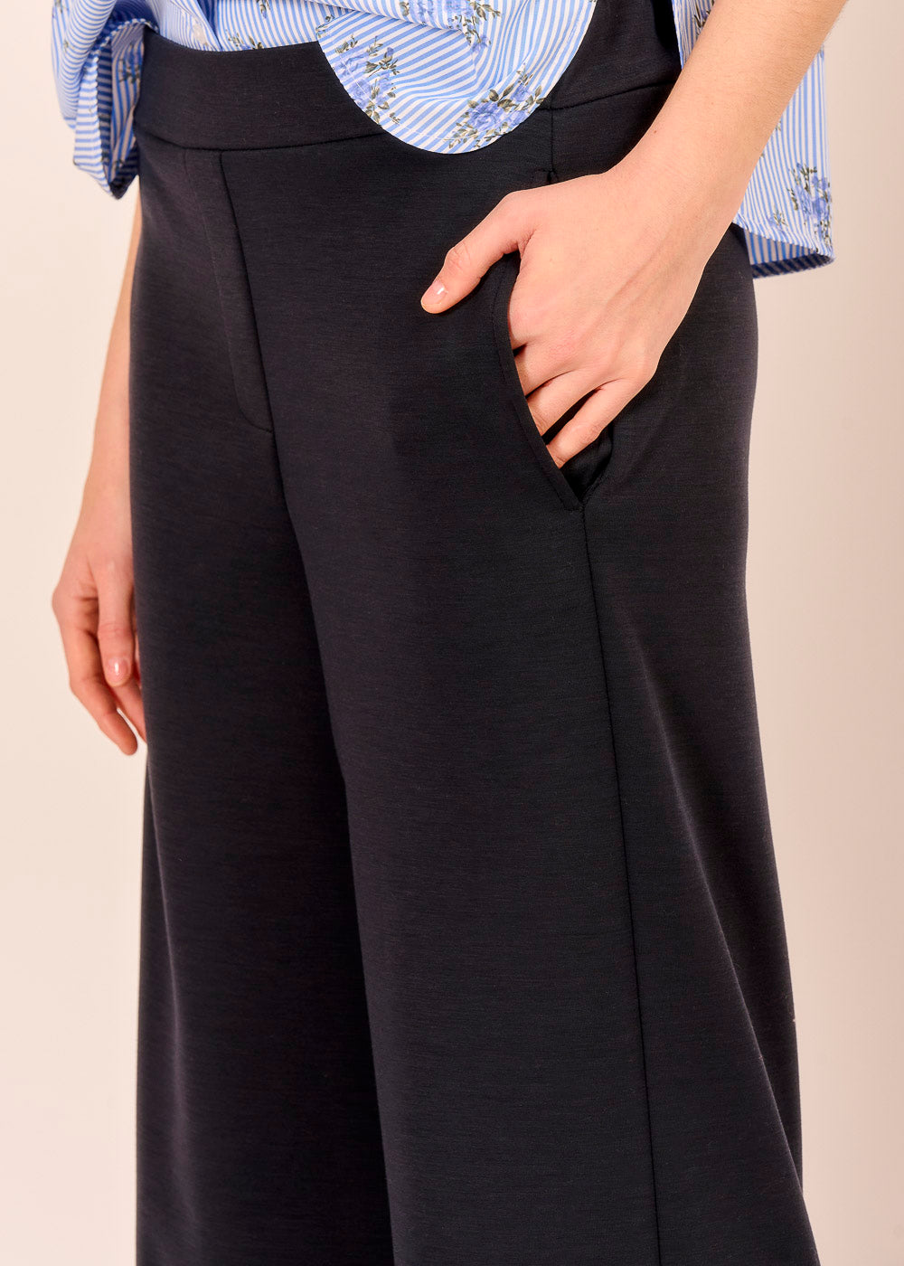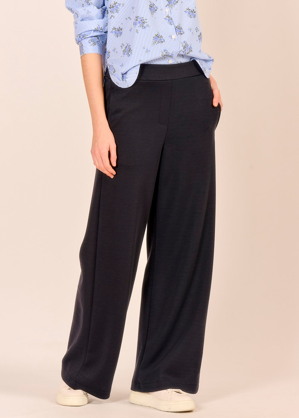 Die dunkelblaue Pantalone strahlt selbstverständliche Eleganz aus. Der fließende Schnitt schenkt dir Bewegungsfreiheit und formt gleichzeitig eine feminine Silhouette. Ob elegant mit einer Bluse oder lässig mit einem Bomberino kombiniert – diese Pantalone ist perfekt für den Alltag.