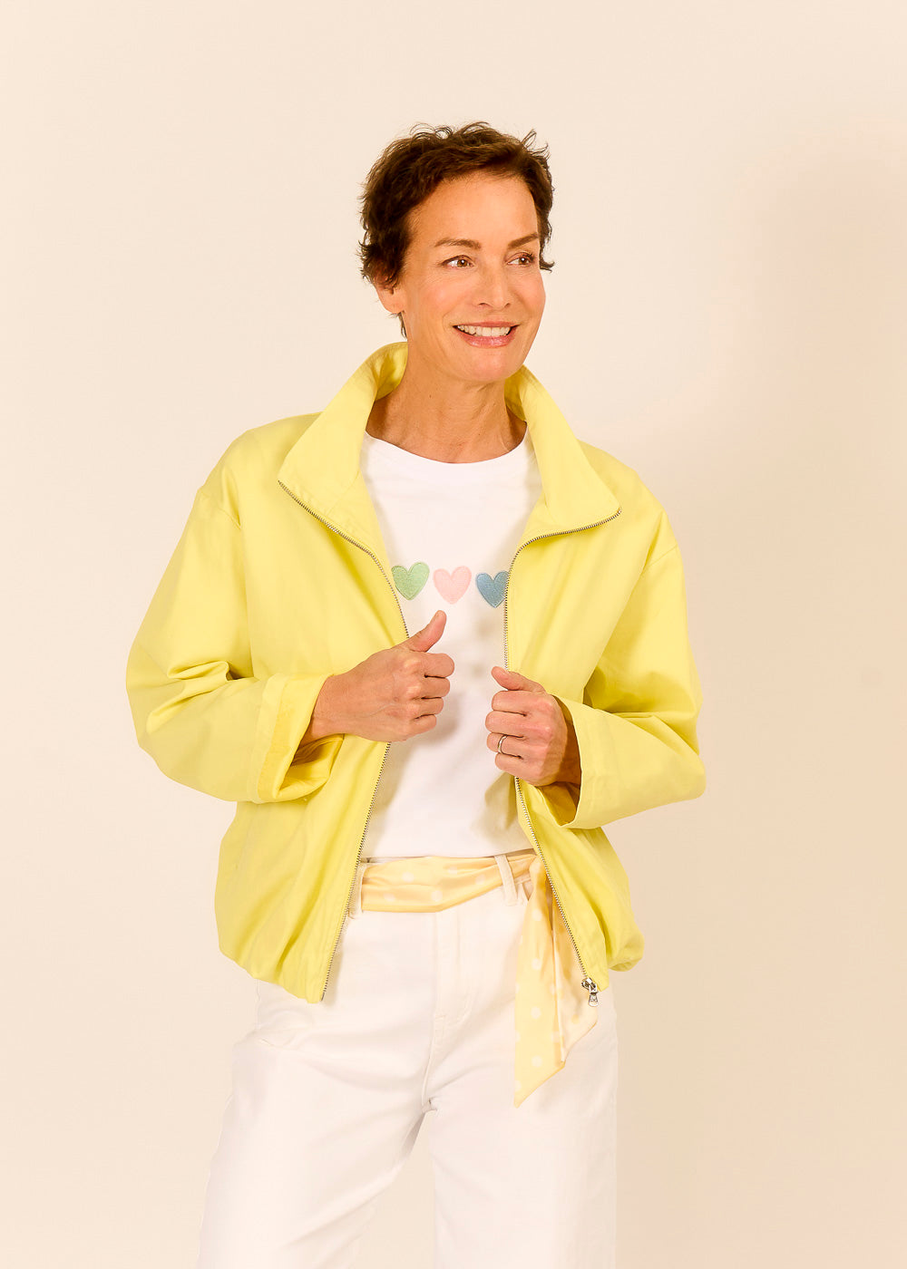 Diese gelbe Jacke ist wie ein Sonnenstrahl zum Anziehen. Kombiniert mit weißem Shirt und Denim entsteht der perfekte Look für den Frühlingsspaziergang. Der geschoppte Bund sorgt für eine sportliche und gleichzeitig trendbewusste Ausstrahlung.