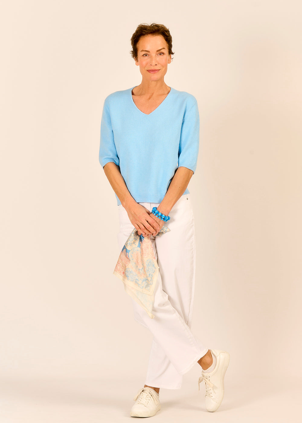 Der himmelblaue Halbarm-Pulli strahlt Ruhe, Eleganz und Frische aus. Dank des Viskoseanteils fühlt sich das Material angenehm weich auf der Haut an und ist perfekt für kühle Frühlingstage.