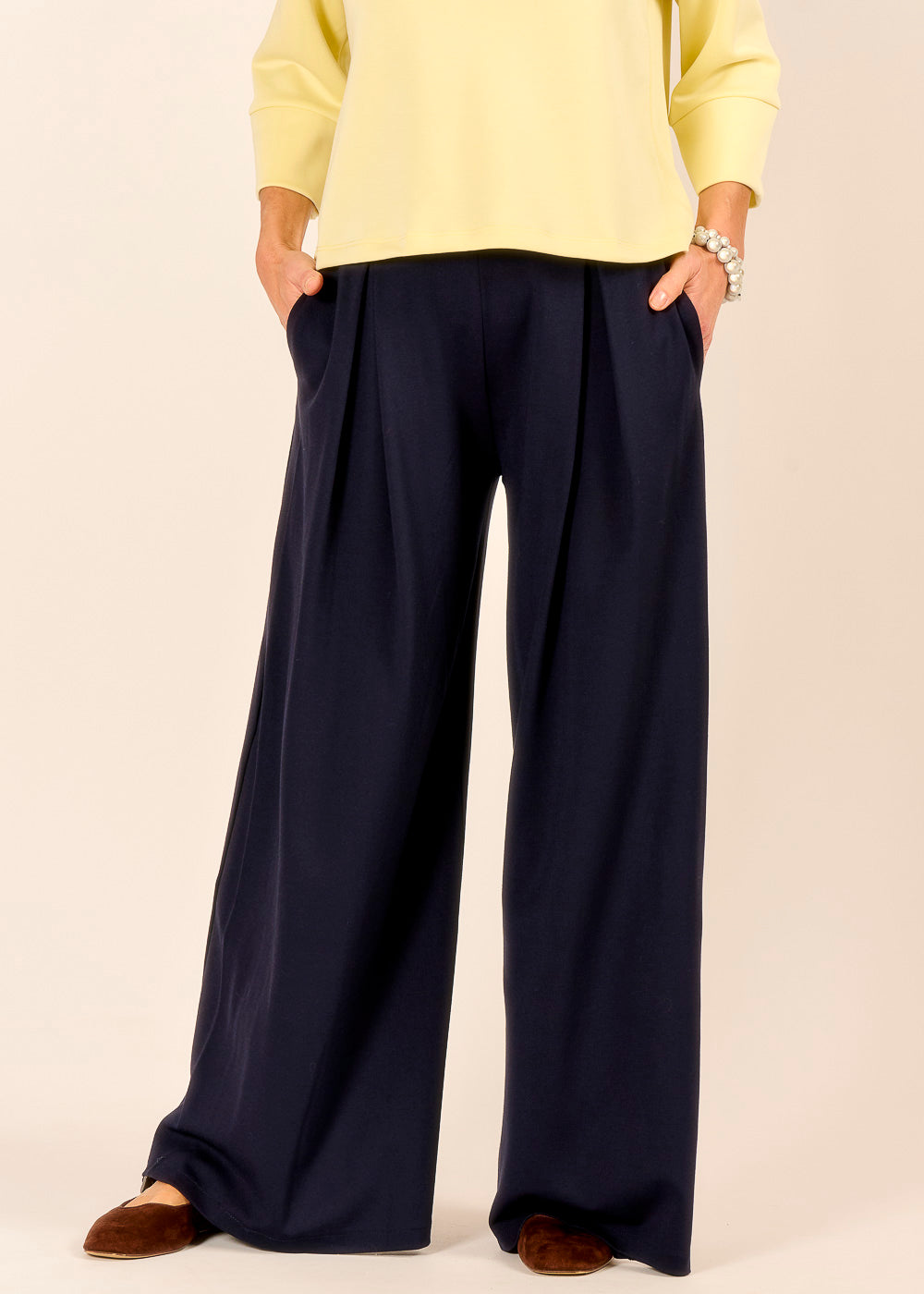Die Falten verleihen der dunkelblauen Pantalone eine feminine, fließende Silhouette, während die hochwertige Viskose für ein komfortables Tragegefühl sorgt. Ein Lieblingsstück für alle, die Komfort und zeitlose Eleganz perfekt verbinden möchten.