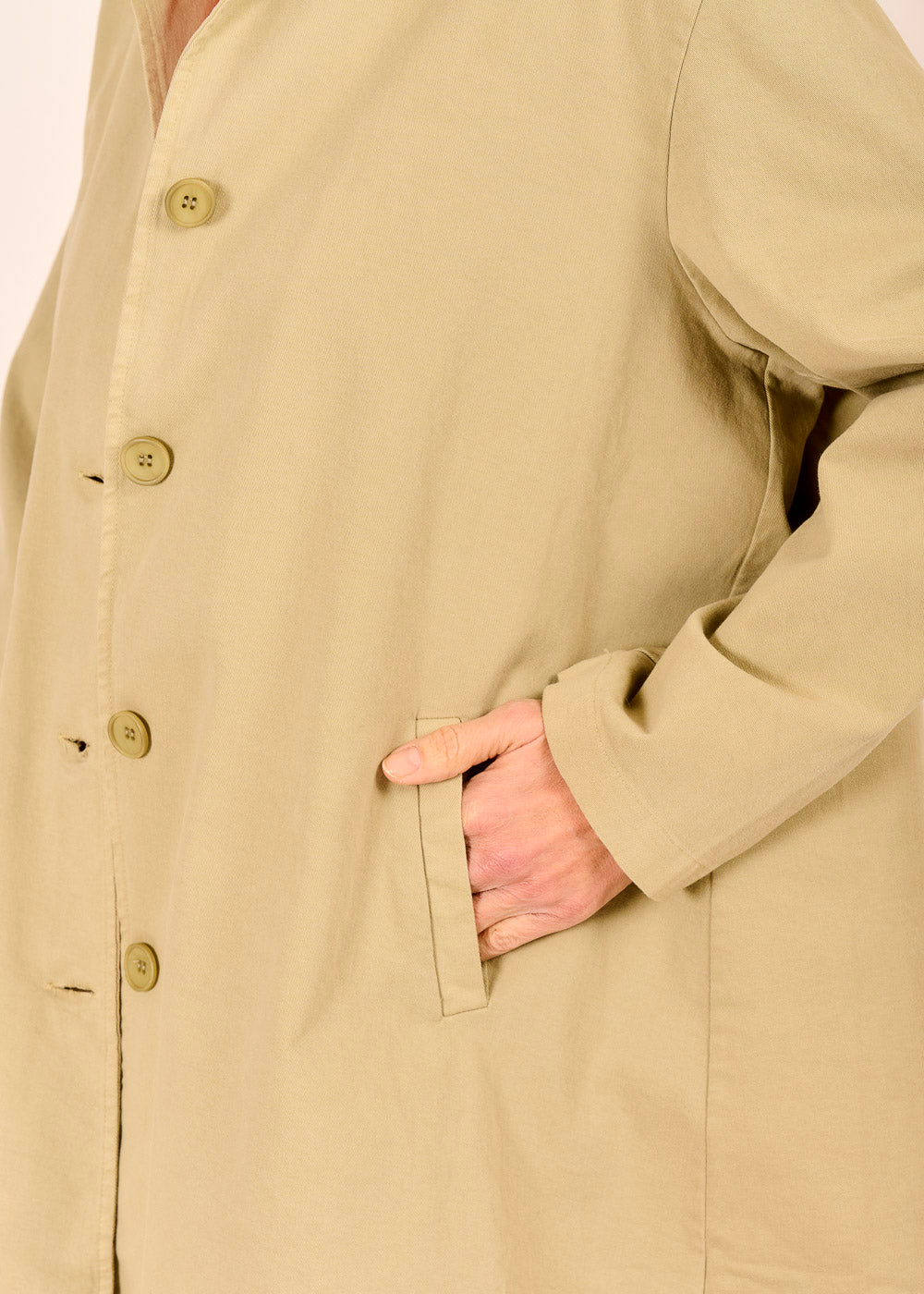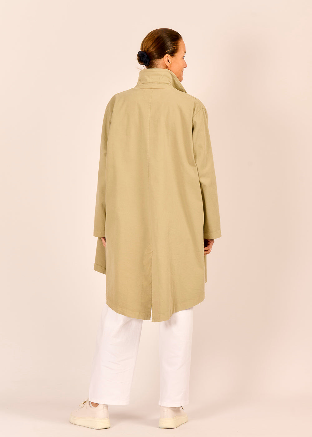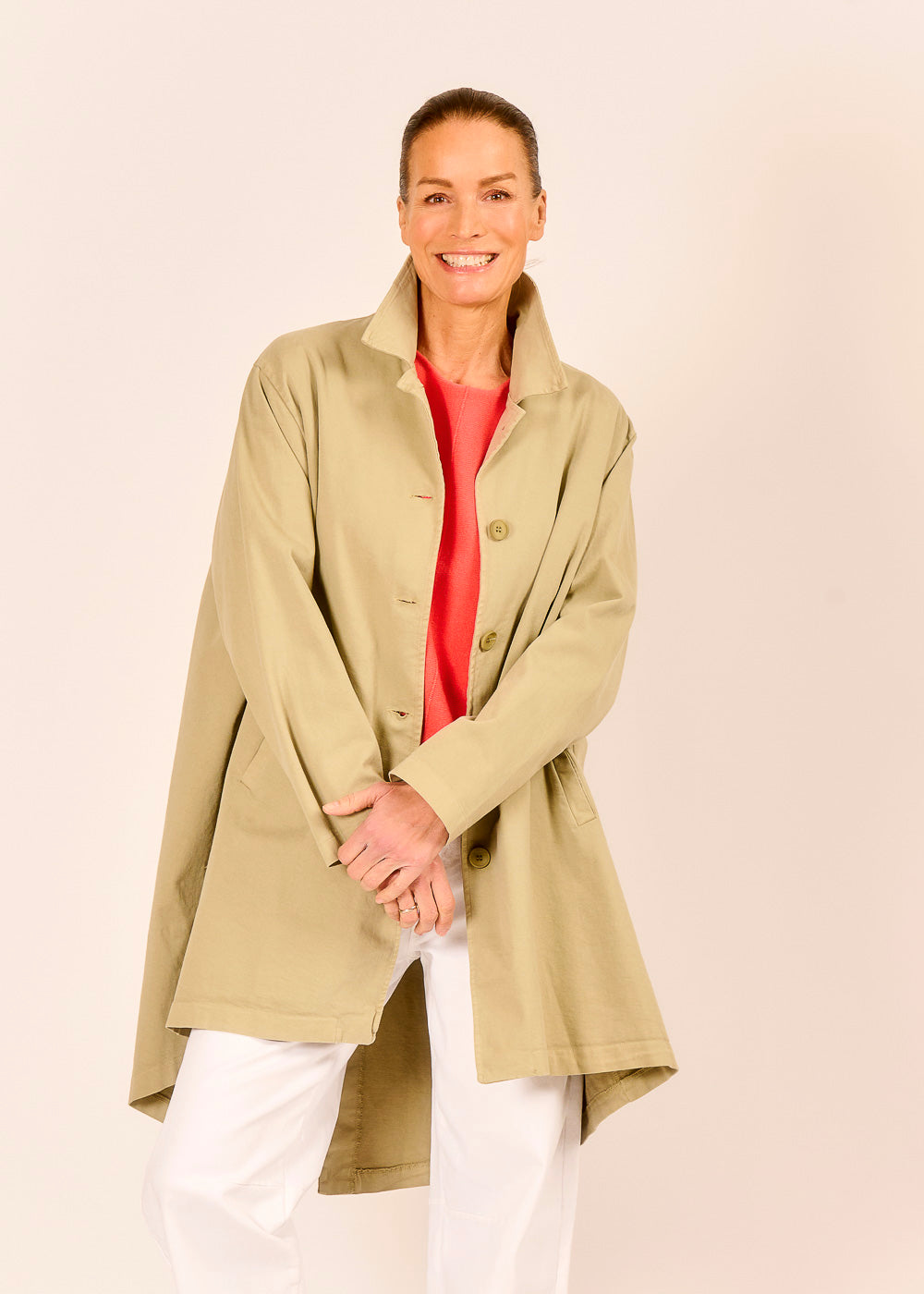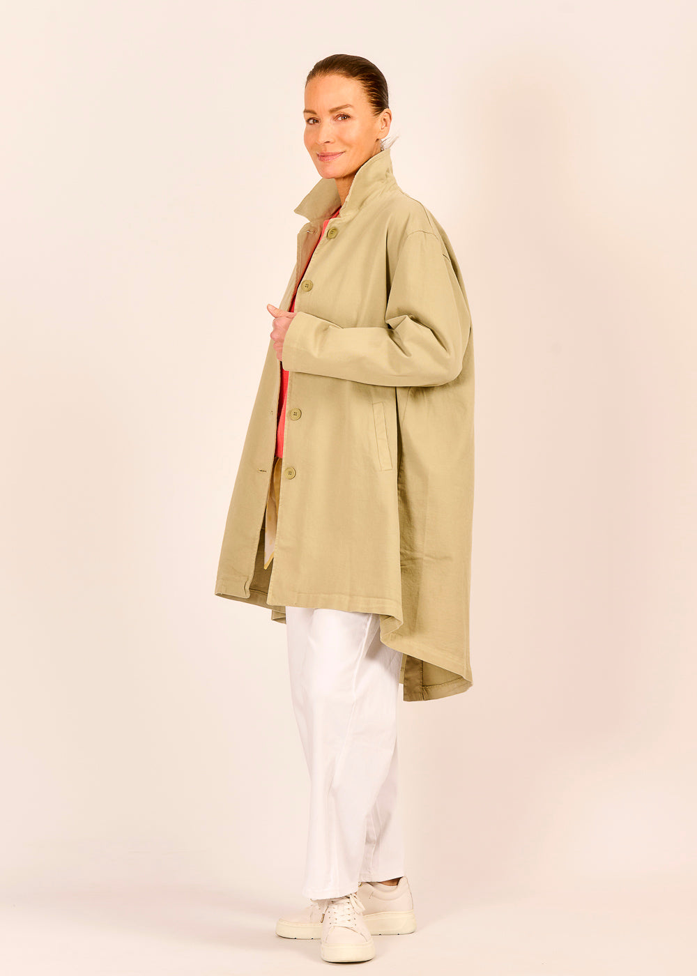 Der salbeifarbene Mantel aus leichter Baumwolle ist wie geschaffen für Tage, an denen du dich frei bewegen und dennoch stilvoll auftreten möchtest. Der modische Schnitt schenkt dir eine lässige Silhouette, die zugleich modern und zeitlos wirkt. Er umspielt deine Figur wirkt selbstbewusst, entspannt und souverän.
