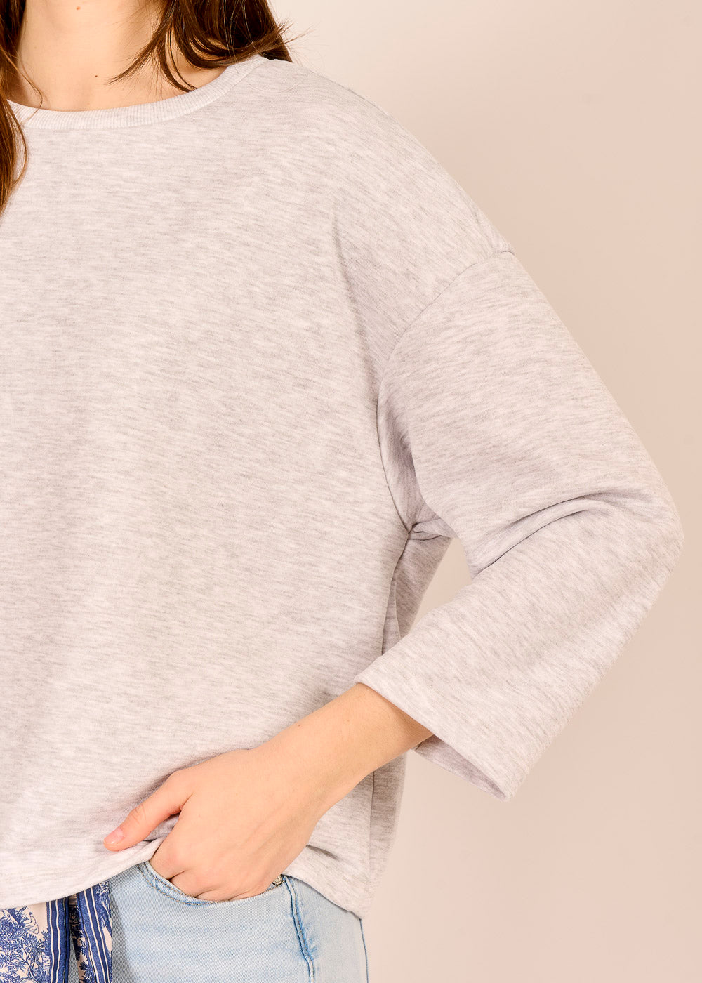 Der lässig geschnittene Sweaty mit 3/4-Arm ist der perfekte Freizeitlook. Helles Grau lässt sich mühelos kombinieren – ob entspannt, modern oder mit farblichen Akzenten.